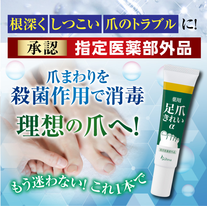 爪まわりを殺菌作用で消毒、有効成分ベンザルコニウム塩化物が角質層に浸透し、洗浄・消毒をします。3種類の保湿成分も配合しているので、乾燥からも守ります。「洗浄・消毒・保湿」がこれ1本で整います。自信が持てるクリアな足爪へ。