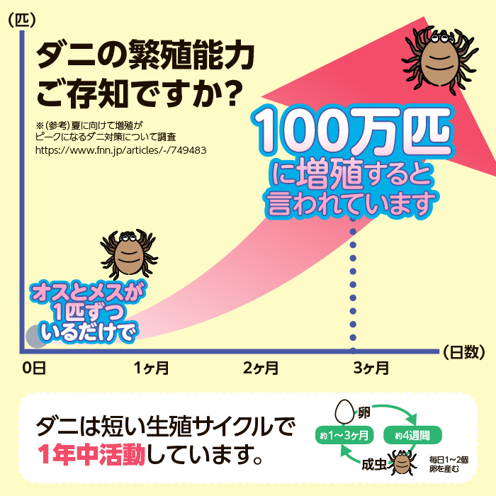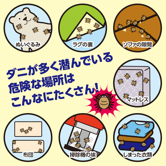 ダニは刺されたときの強いかゆみの他、死骸やフンが体内に侵入すると喘息やアトピー、鼻炎などのアレルギー性疾患を引き起こす可能性があります。