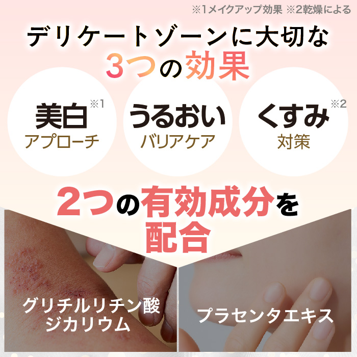 デリケートゾーンの悩みに。塗ってすぐにトーンアップする速攻の美白※1と、未来のメラニンを抑制する継続の美白※2で気になるくすみにアプローチします。有効成分のグリチルリチン酸ジカリウムとプラセンタエキスをW配合の医薬部外品。